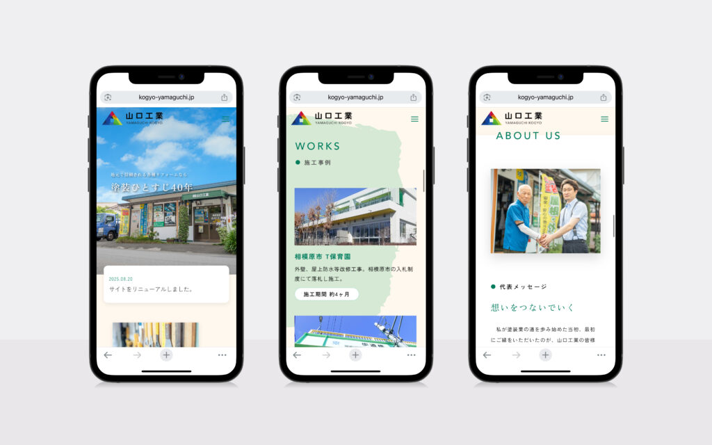 サイト全体では施工事例やTOPページを中心に、山口工業様の雰囲気が伝わる写真を多く使用していました。