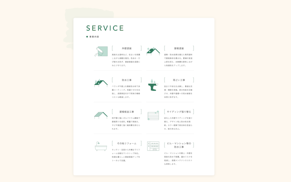 そのため事業内容の部分では写真を中心としたサイトの雰囲気に合わせつつ、施工に関する文章やタイトルとのバランスを考慮し、視覚的にも分かりやすいシンプルでサイトのトーンにあったアイコンを作成しました。