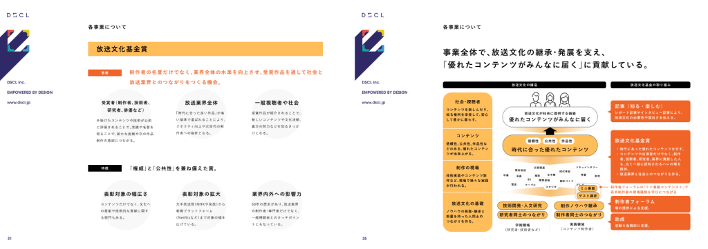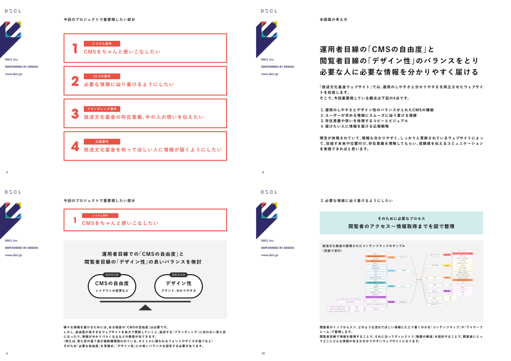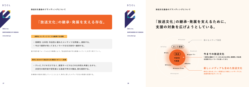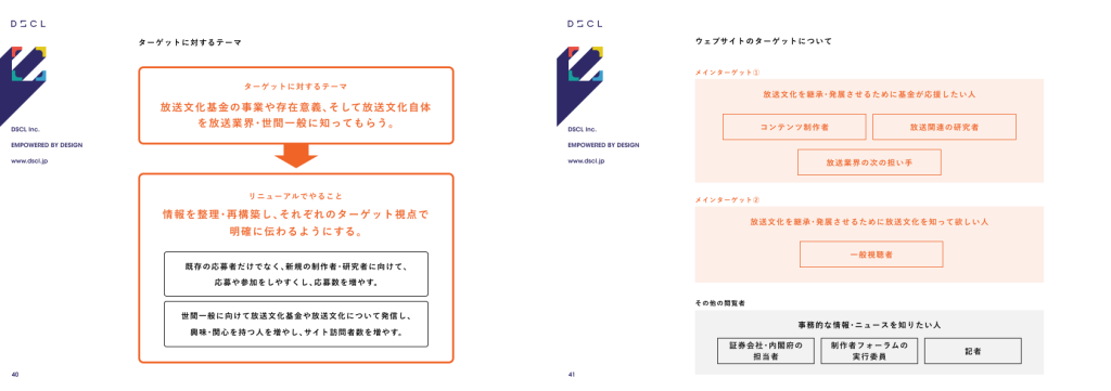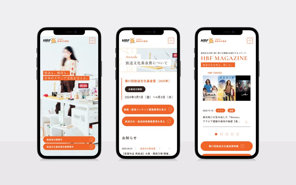 今回のプロジェクトでは、ウェブの機能整理・拡張をきっかけにした内容の再構築だけでなく、ヒアリングを通して伺った、大事にしている思いや財団の持ちうる価値を紐解いて整理し、「放送文化基金」自身のブランディング策定の支援も行いました。