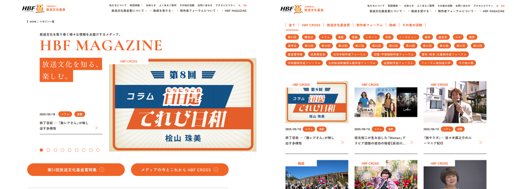 放送文化基金賞や助成は時期によって表示を切り替える必要があるので、そういった表示タイミングも含めて使いやすいよう制作しています。