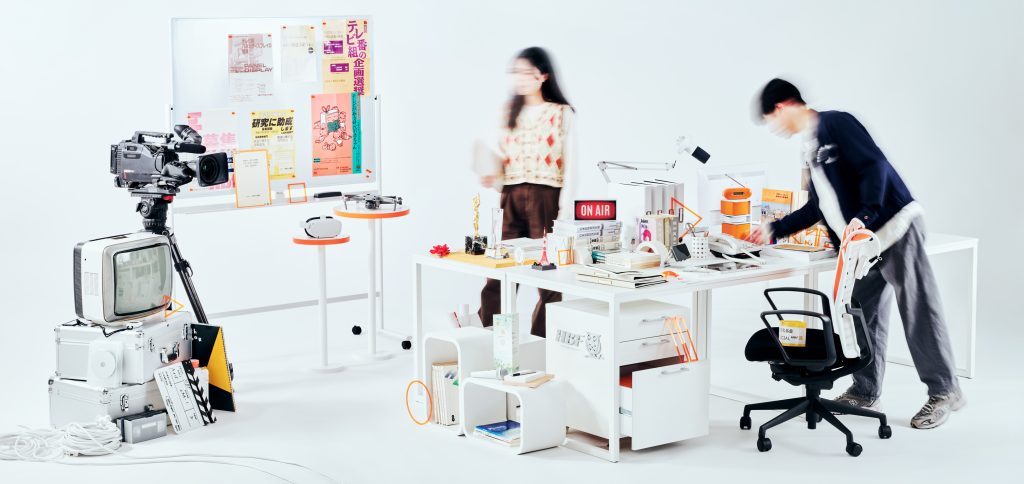 テレビ、カメラ、カチンコ、VRゴーグル、発行物、などをモチーフに、過去と未来の放送文化を表現。