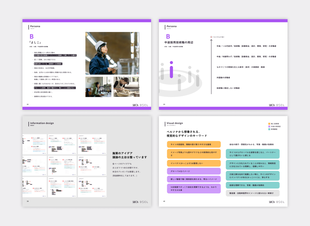 実際の検討資料では、3種類のペルソナを設定し、それぞれの人物像がどのようにサイトを利用し、どのように行動するかを想定。その上で、情報設計を進めていきました。