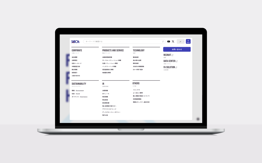 リニューアル後のサイトでは、メガメニューを導入し、どのページからでも必要な情報へスムーズに移動できるようにしました。表示時にはカテゴリーごとの情報を一覧性高く整理し、目的のページを直感的に探し出せる構成にしています。
