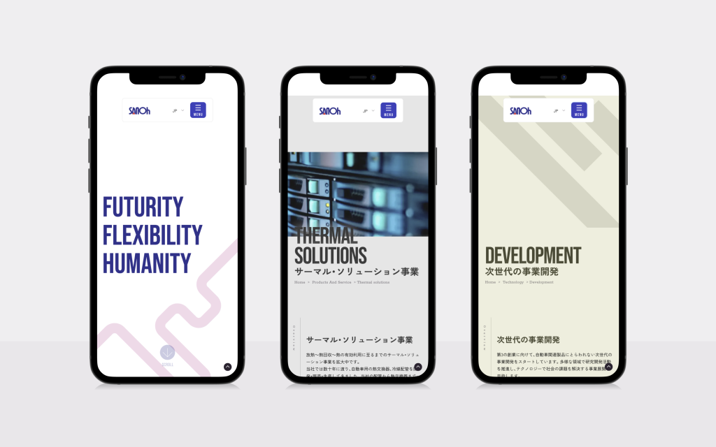 また、メインビジュアルにはモーショングラフィックを採用。これにより「製造業」という枠にとどまらず、「企業の技術力」へと視線を向けさせる演出を行いました。さらに、セカンダリーページにおいても幾何学的なグラフィックをファーストビューに取り入れ、統一感と先進性を感じられるデザインとしています。